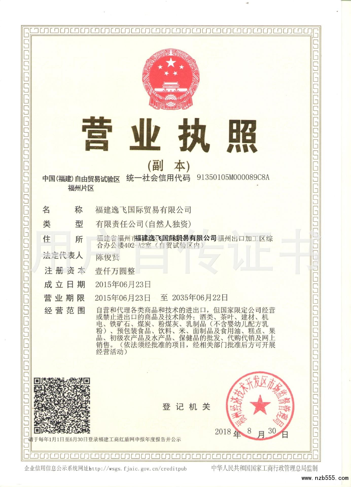| 發(fā)證機(jī)構(gòu): | 福州經(jīng)濟(jì)技術(shù)開(kāi)發(fā)區(qū)市場(chǎng)監(jiān)督管理局 | 發(fā)證時(shí)間 : | 2018-08-30 |