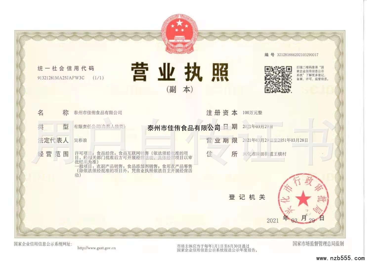 | 發(fā)證機(jī)構(gòu): | 興化市行政審批局 | 發(fā)證時(shí)間 : | 2021-03-29 |